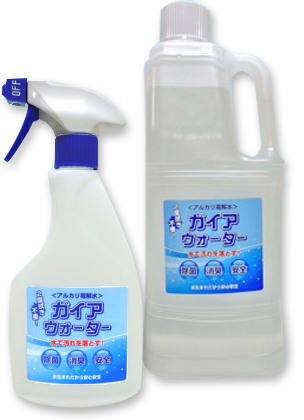 ガイアウォーターは界面活性剤・薬品及び添加物などの化学合成物質を全く含まない水なので人にも環境にもやさしい安全な洗浄水です。
